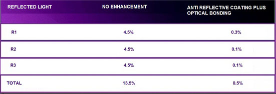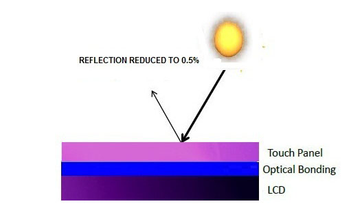The increased light transmission of a screen with optical bonding significantly reduces glare from external light sources..Since traditional coverplates often are not treated with anti-reflective (AR) coatings their multiple surfaces result in high reflectivity. By bonding the front AR-coated substrate directly to the display bonding technology creates a single surface with low reflectivity and increases display contrast ratio by as much as 400% for optimum outdoor viewing without increasing power consumption.