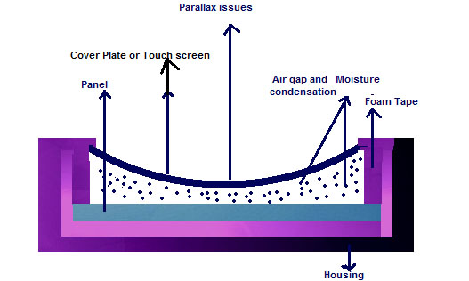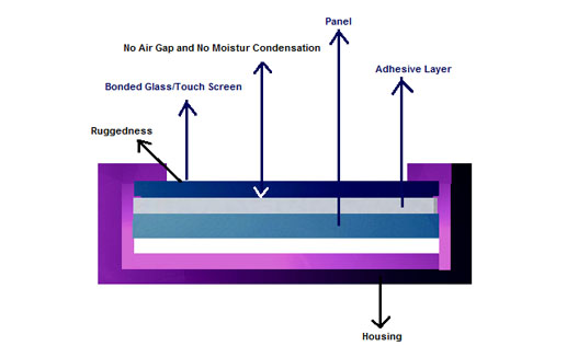Optical bonding avoids the air gap between the Cover glass or Touchscreen and LCD surfaces and also does not allow dust and dirt to penetrate. The danger of splintering glass is considerably reduced with full-surface bonding with adhesive.