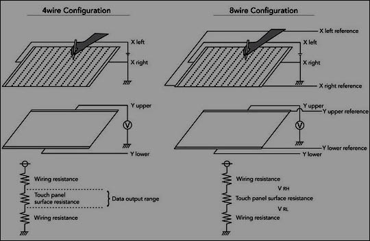 8-wiretouch panels are on the 4-wire technology principle by adding an additional 4-wire set. Having the additional set doubles the level of electrodes and in turn will increase the overall accuracy and reduces drifts so you won't have to recalibrate as much as you would with a 4 or 5 wire touch panel.