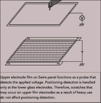 5-wire touch panels are constructed with a film that is suspended over the top layer and voltage is simultaneously measured at each corner. When a user touches the top surface it becomes in contact with the bottom layer causing a change in resistance which would then be calculated by the controller. Since the top layer is acting only as a probe it will still function even if the panel surface is damaged.